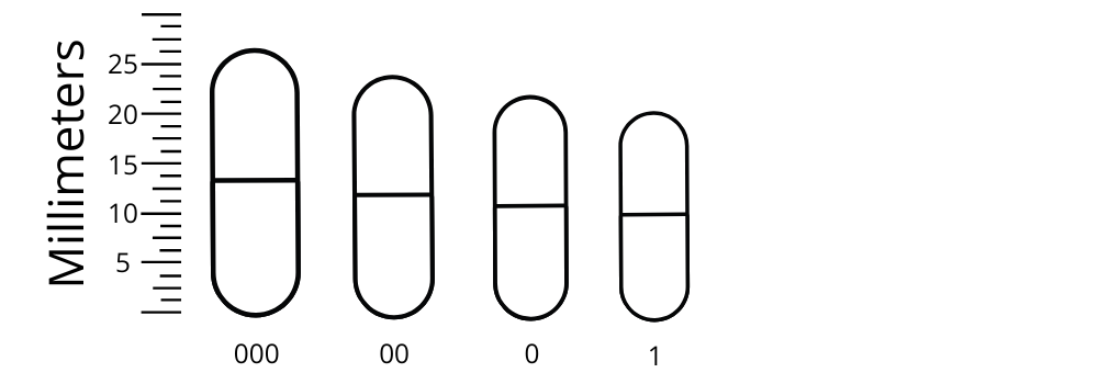 Refer to the chart below for a visual comparison of capsule sizes from 000 to 1.